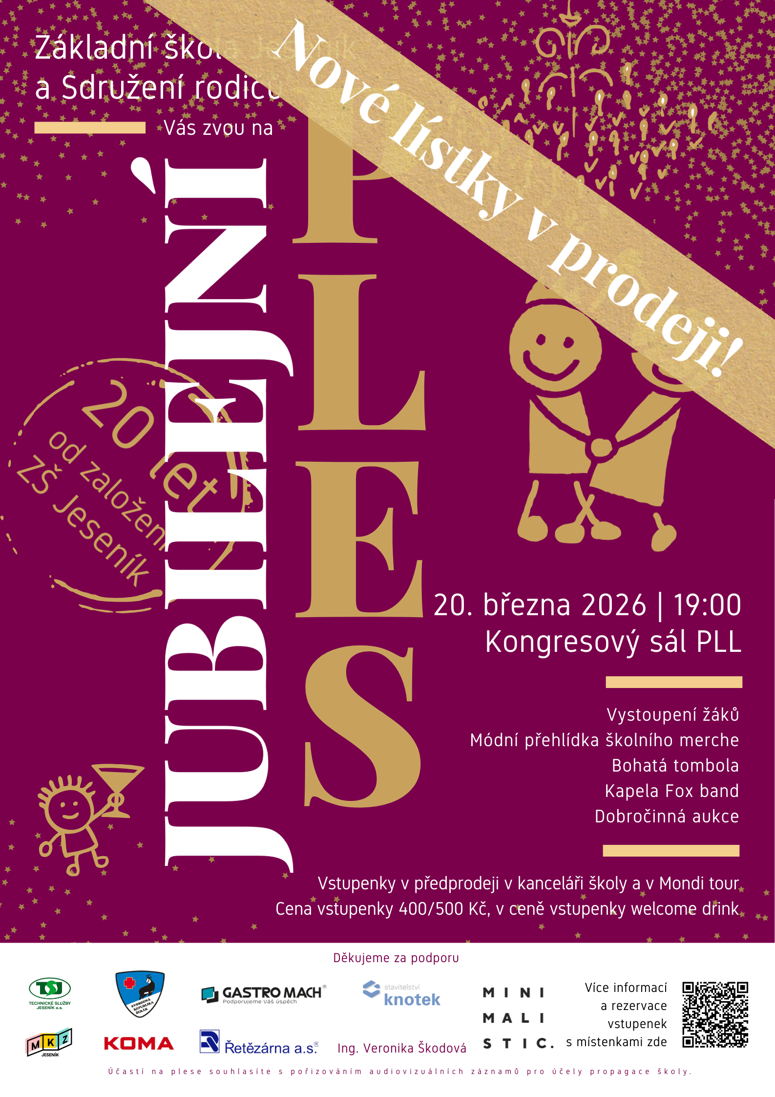 Zájem o jubilejní školní ples ZŠ Jeseník nás velmi těší. Kapacita přízemí sálu je již plně obsazena, a proto jsme se rozhodli uvolnit další vstupenky do prodeje.