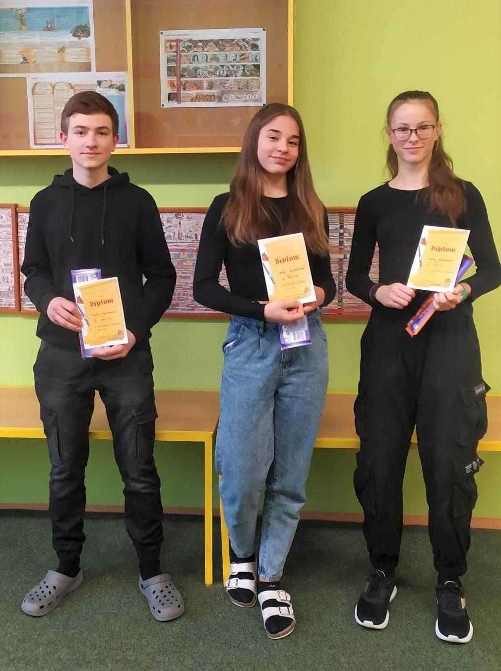 Vítězem se stala Sára Sedláčková z 9. C, Vašek Zlámal z 9. B obsadil 2. místo a na 3. místě skončila Petra Hořejšová z 9. B. Vítězům gratulujeme a přejeme mnoho úspěchů v okresním kole.